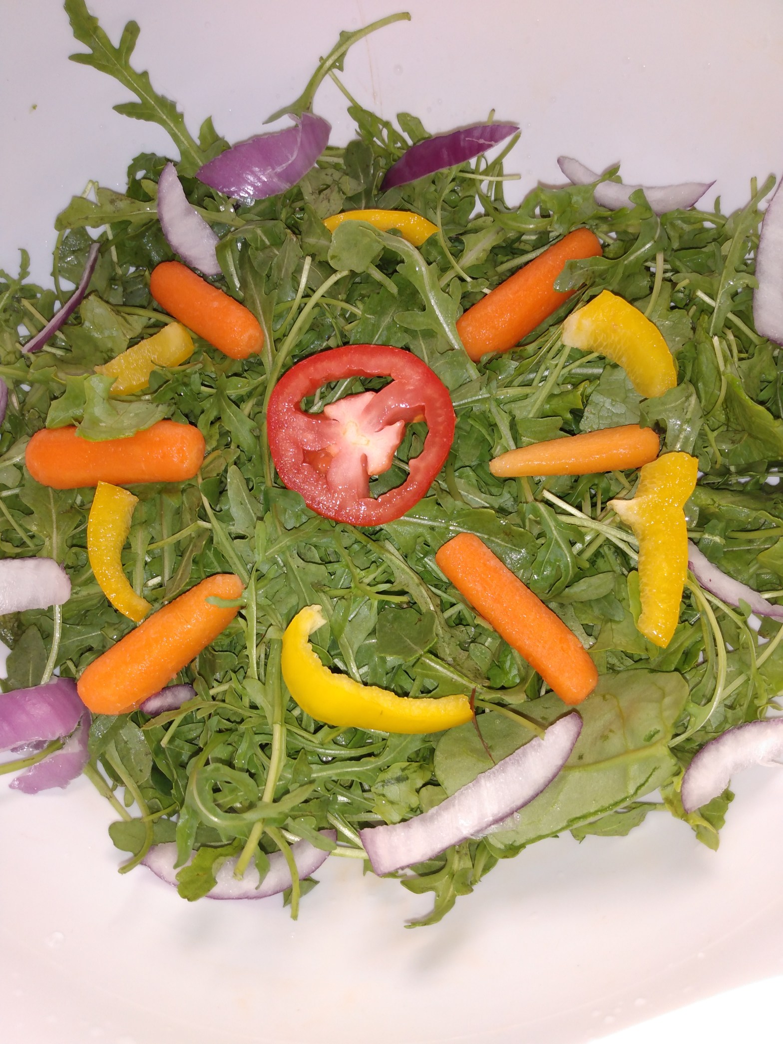 Baby Arugula Salad This recipe consist of simple salad dressing of olive oil seasalt and Baby Arugula, yellow bell peppers, purple onions, and one single tomatoe .